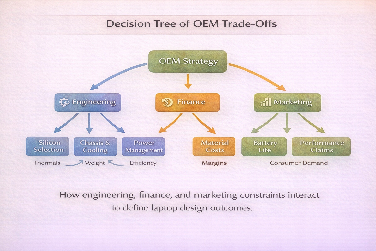 OEM decision-making is a negotiation among three primary forces: engineering, finance, and marketing. Each decision cascades: increase cooling, and weight rises, impacting portability. Extend battery life, and cost increases, affecting price points. Market wants sleek, premium devices, often ignoring thermal ceilings and long-term degradation.