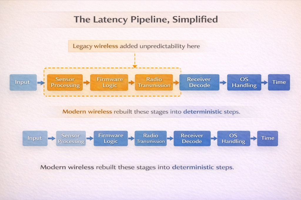 This eliminates jitter—the inconsistency that made older wireless feel “off” even when average latency looked acceptable.